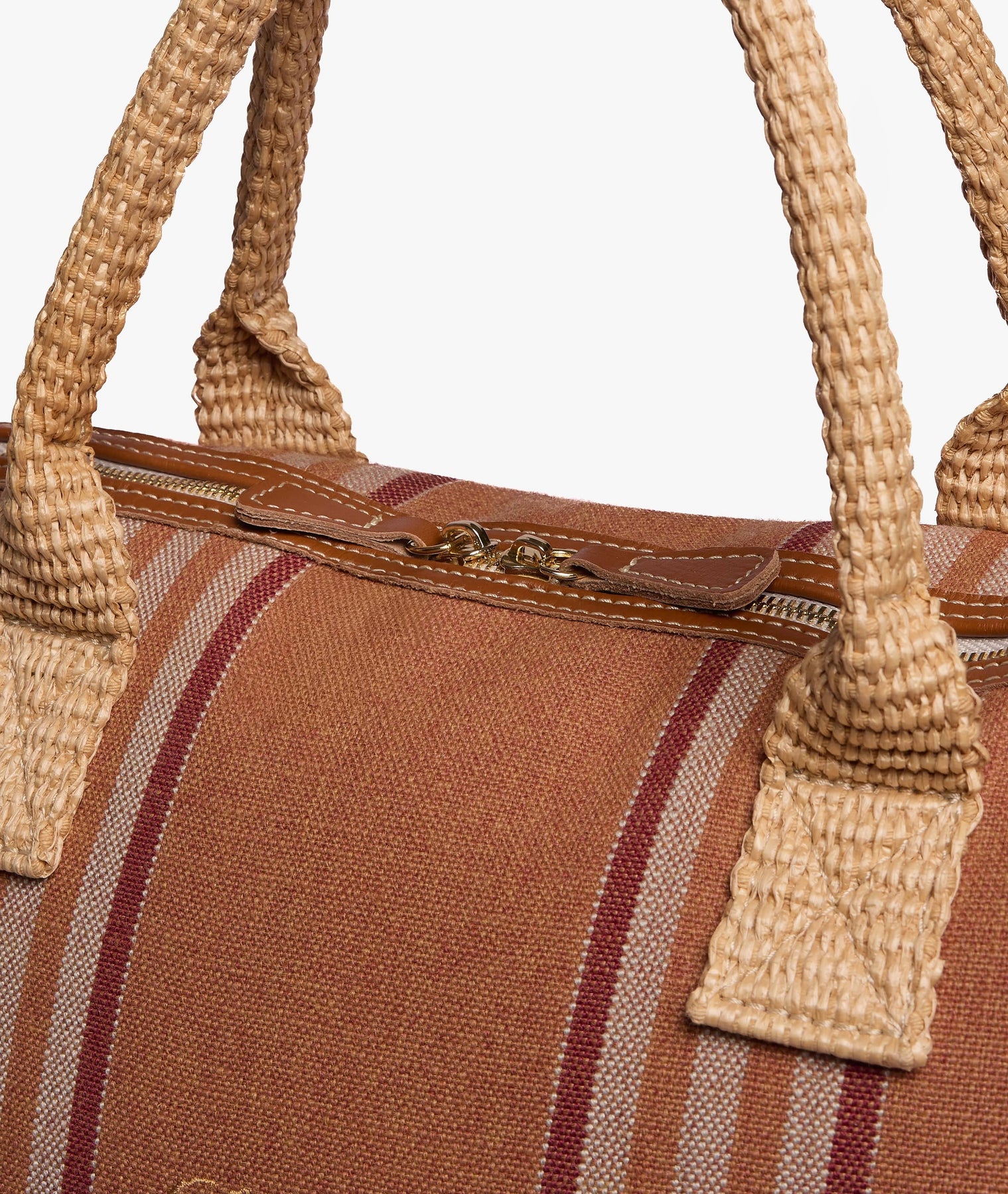 The London Smart Antibes Travel Duffle Bag in Terracotta expresses Mediterranean elegance in a deep, refined shade inspired by coastal greenery and the sunlit Riviera. The striped fabric in green, sand, and ivory creates a natural, sophisticated colour balance, while the woven straw-effect base and handles add a distinctive textured detail with timeless resort appeal.