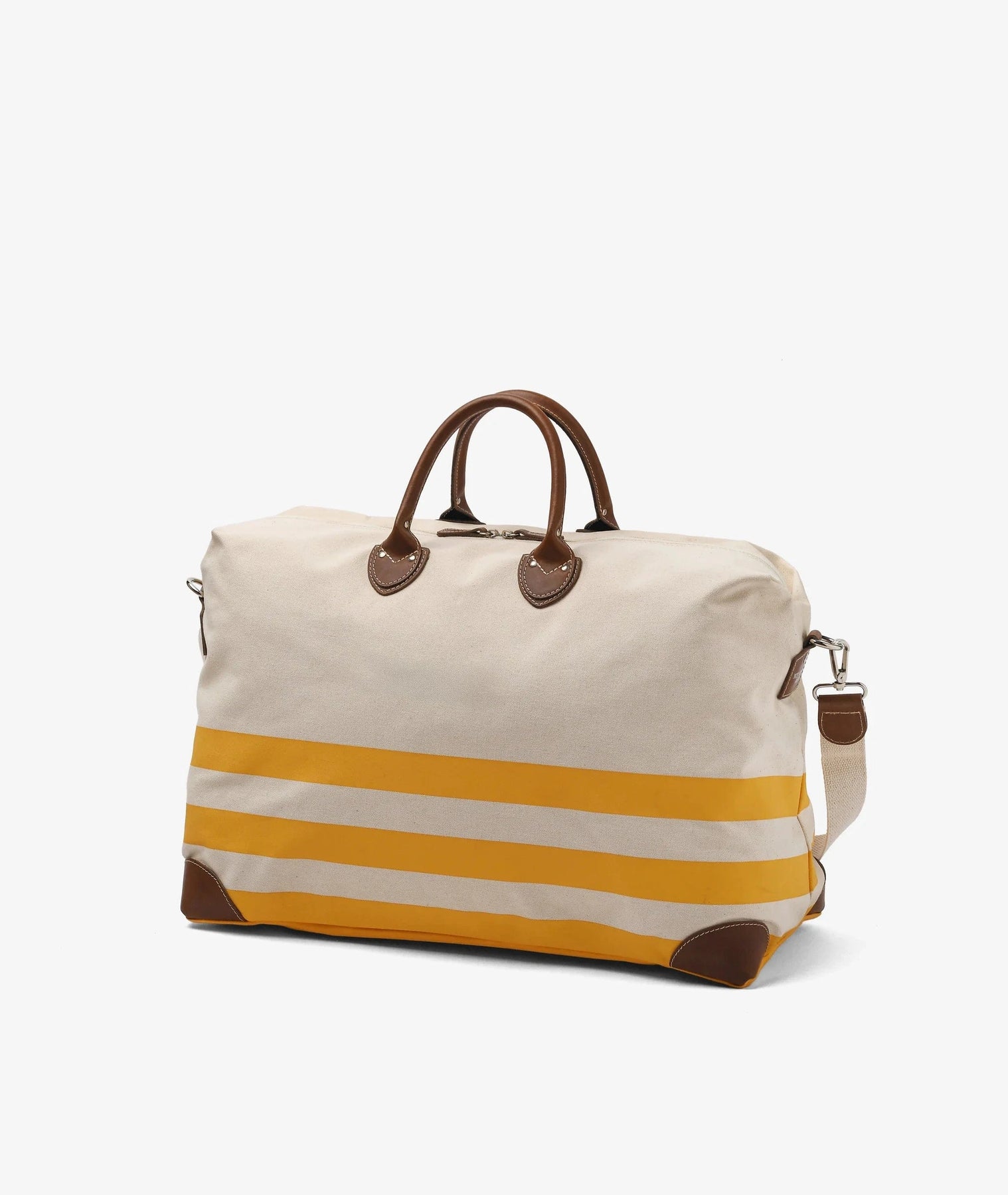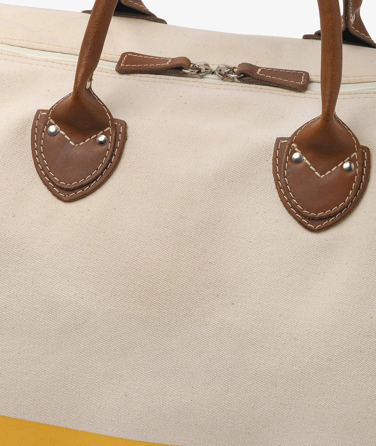 Made of durable canvas fabric with a refined yellow hue and striped details on the bottom, this duffel bag recalls the bright and sunny atmospheres of the Greek islands. Leather details, such as the handles and zipper pull, add a sophisticated touch, while the non-metal zipper and silver-colored metal details ensure lightness and durability. The adjustable raw tape shoulder strap allows for practical and comfortable transport.