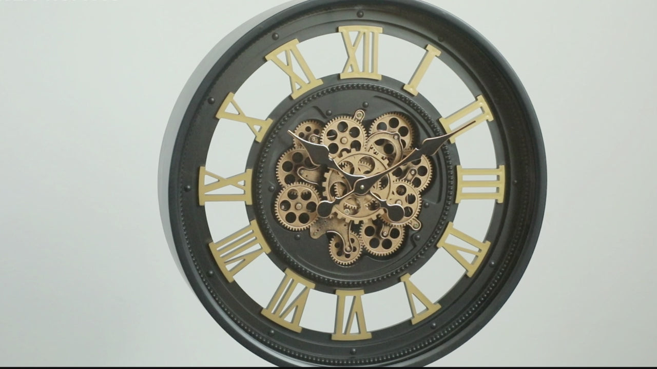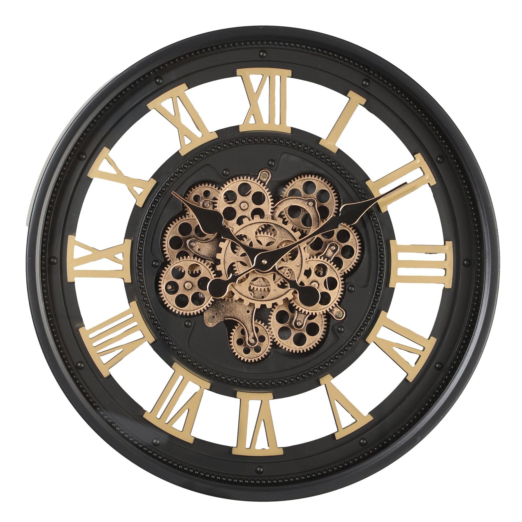 This stylish wall clock blends clean, modern design with a touch of classic charm. Its metal frame and cut-out Roman numerals give it an Italian feel, while the unpolished look keeps it neutral. The exposed gears let you see the clock's inner workings as the black hands move. With its black face and rustic gold details, this clock is a unique and eye-catching addition.
